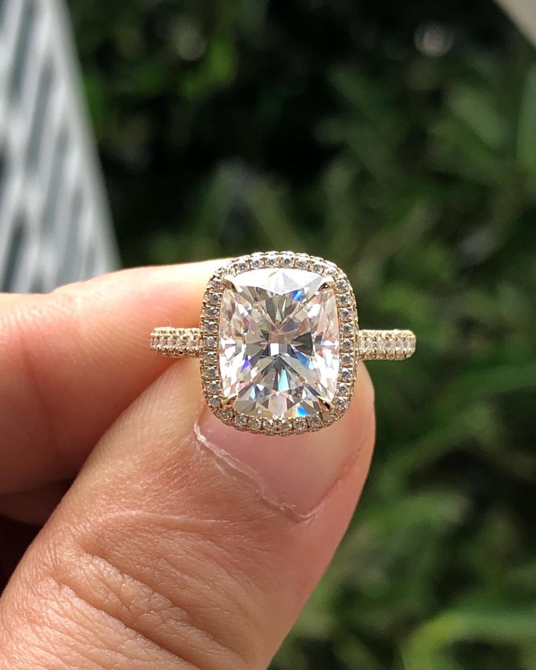Halo & Triple Pave Ring with 2.66 CT Elongated Cushion Cut Moissanite
